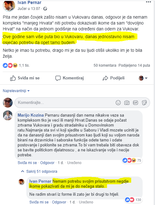 Pernar tvrdi da se u Vukovaru dokazuje lažno hrvatstvo. Potpuno je ravnodušan  na bol toga grada što je zastrašujuće. Kolona sjećanja postoji kao sjećanje na enormnu patnju, a ne da bi netko dokazivao hrvatstvo.
