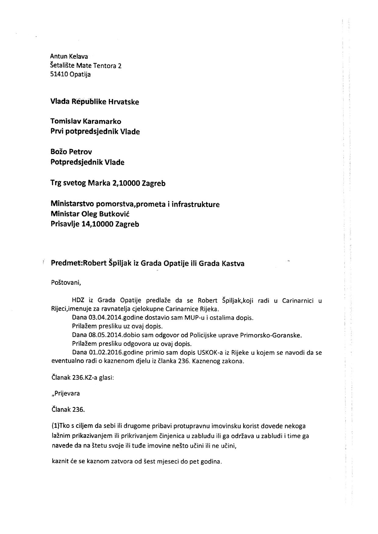 Robert Špiljak je bio na funkciju u MORH i iz MORH-a prelazi u Carinarnicu Rijeka na rukovodeće mjesto šefa Službe za kadrove,  njegove prelaske kao iz Reala u Barcelonu povezuju svjedoci sa Vanjom  Špiljkom, sinom komunističkog drmatora (koji se povezuje i sa Đurekovićem u slučaju INA) i prijatelja mu  iz kradezea Olega Butkovića gradonačelnika Novog Vinodolskog koji mu je omogućio gradnju elitne marine , a tu je navodno u igri  kum Ivan Kraljić-Ico pročelnik Carinarnice Rijeka, čiji prijatelj je poznati Riječki udbaš Livio Tončinić koji je prijatelj sa famoznim  Vanjom Špiljkom,  a neki kažu da je tom linijom postao časni sudac. Drugim riječima kao da Titin ljigavac Mika Špiljak živ, sve ide po jugo-špagi.