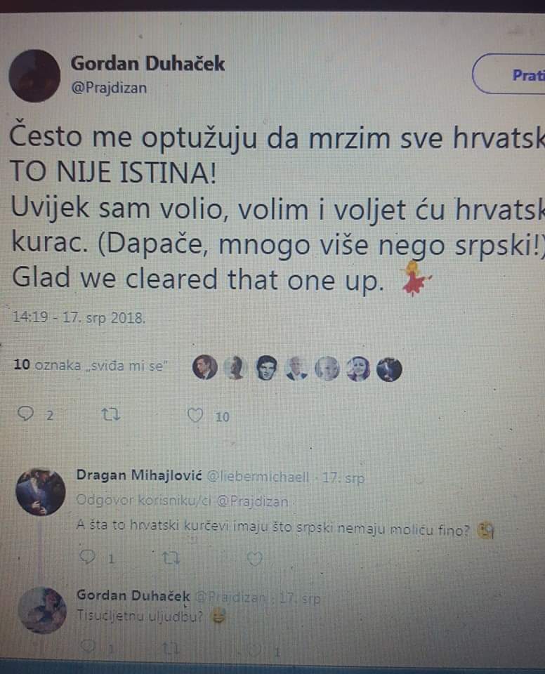 Što ih povezuje vidi se iz pisanja i mnogih stavova o životu. Jedan od najvećih je mržnja prema Hrvatskoj. Nije jasno zbog čega je uopće doselio ovdje ako nas truje mržnjom prema Hrvatskoj i maltretira sa pederskim stajalištima.