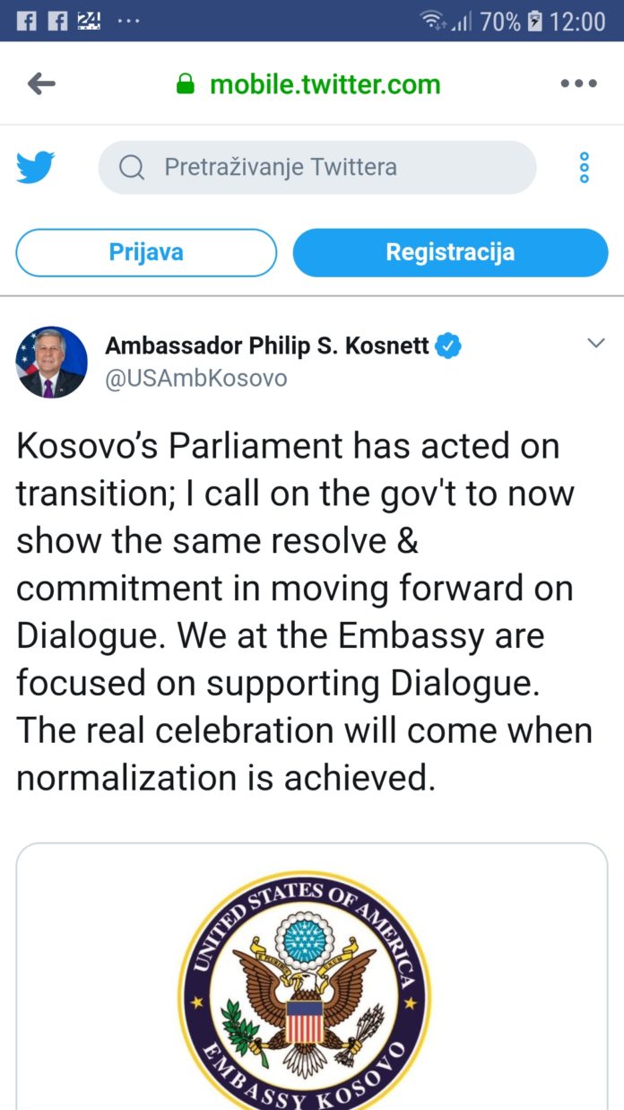 “Glasanje u Skupštini i ceremonija povodom transformacije KSB trebala bi biti prilika za ozbiljno razmišljanje i ponovno posvećivanje miru, stabilnosti i prosperitetu Kosova i njegovih susjeda. Sada je trenutak da se svi lideri i akteri fokusiraju na energiju u vezi sa dijalogom”, napisao je Kosnett na Twitteru.