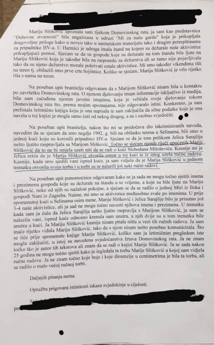 U privatnoj parnici Marije Slišković rođene Esme Golubić jedna od svjedokinja na sudu izjavila je kako je Sliškovićka za vrijeme domovinskog rata ukrala čipku iz napuštene kuće na što ju je ukorila šefica humanitarne organizacije gospođa Jelica Sarajlija. Izjavila je da danas velika humanitarka Marija Slišković je u to vrijeme rijetko bila sa njima, te da na osnovu toga ne vjeruje da je pisala knjige.