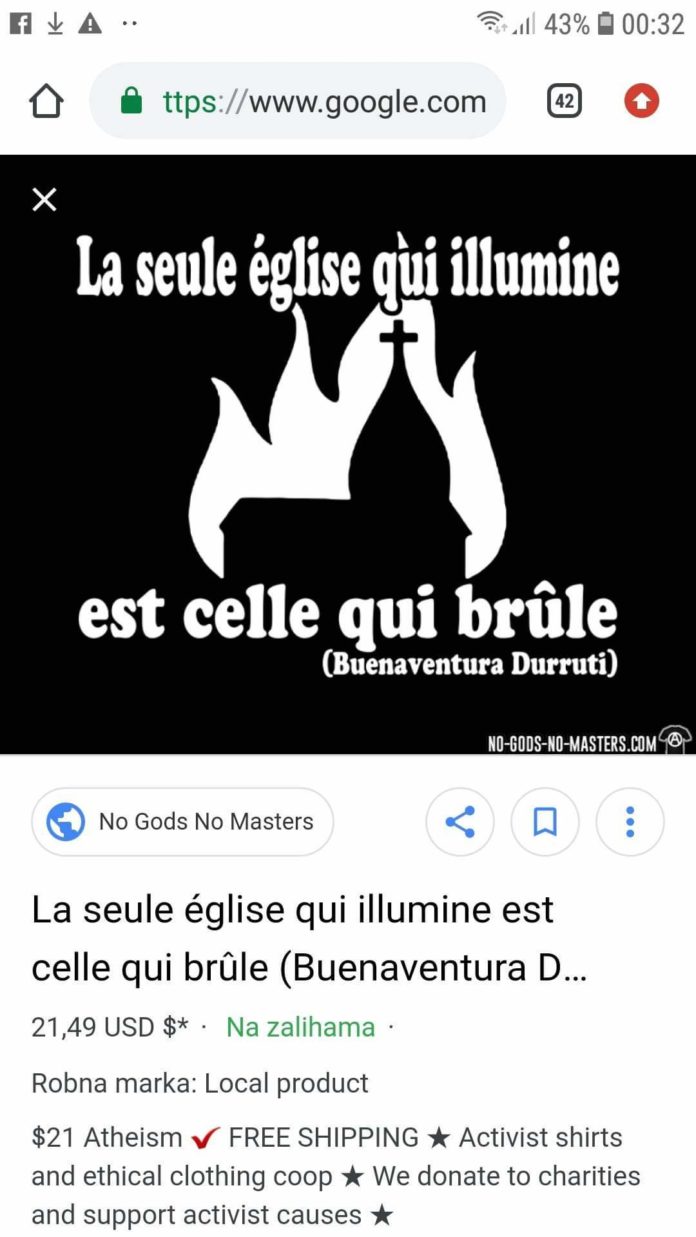 Prodaju se majice koje pozivaju na terorizam, zapaljenje crkava. Francuska policija, baš kao i naša, ne reagira na terorizam. EU politika useljavanja muslimanskih ekstremista želi preko njih uništiti kršćanstvo. Ne radi se tu o ratu muslimana i kršćana, već bezbožnička ekipa Europljana želi pokoriti kršćansku Europu i dati priliku svojoj religiji. Zato se na vratima ove crkve i poziva na palež.