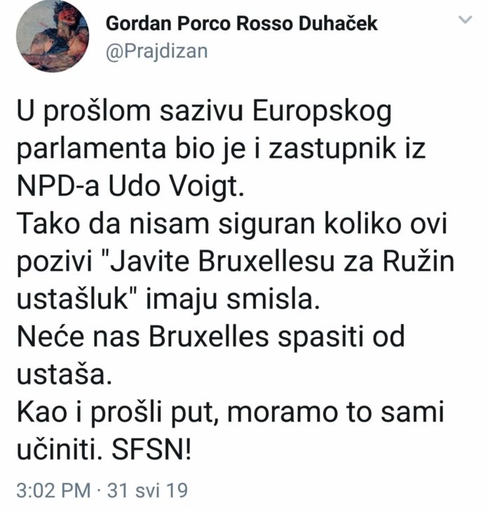 Duhaček ponosni peder iz BiH, po soroševim mjerilima rješavao bi ustaše kao 1945. Koliko je pretili bosanac hrabar pokazao je kada mu je pred redakciju došao Keleminec koga on zove ustašom. Svi su se sakrili u mišju rupu.