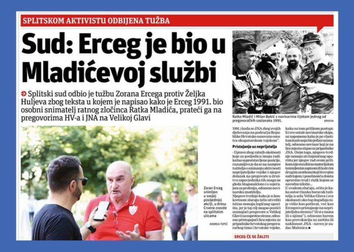 Općinski sud u Splitu nepravomoćno je odbio kao neosnovanu tužbu Zorana Ercega, zbog teksta “Lažni branitelj Zoran Erceg, osobni snimatelj ratnog zločinca” .