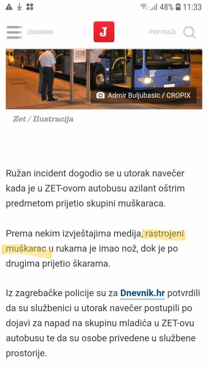 RUŽAN INCIDENT U ZET-ovom AUTOBUSU Rastrojeni muškarac oštrim predmetom prijetio skupini mladića, navodno je riječ o azilantu- piše Jutarnji list.