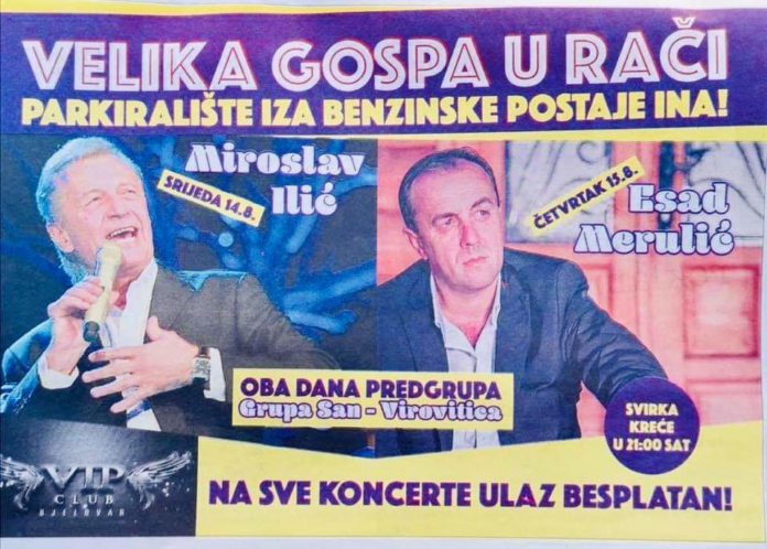 U Novoj Rači, općini u Bjelovarsko-bilogorskoj županiji, dan uoči velikog hrvatakog i katoličkog blagdana Velike Gospe – 14. kolovoza, nastupit će notorni Miroslav Ilić, srpski “pevač narodnjaka” poznat po veličanju četničkog vojvode Draže Mihailovića. Na sam blagdan Velike Gospe – u četvrtak, 15. kolovoza, HSS i HDZ u Novu Raču dovode izvjesnog Esada Merulića, također “pevača narodnjaka”…