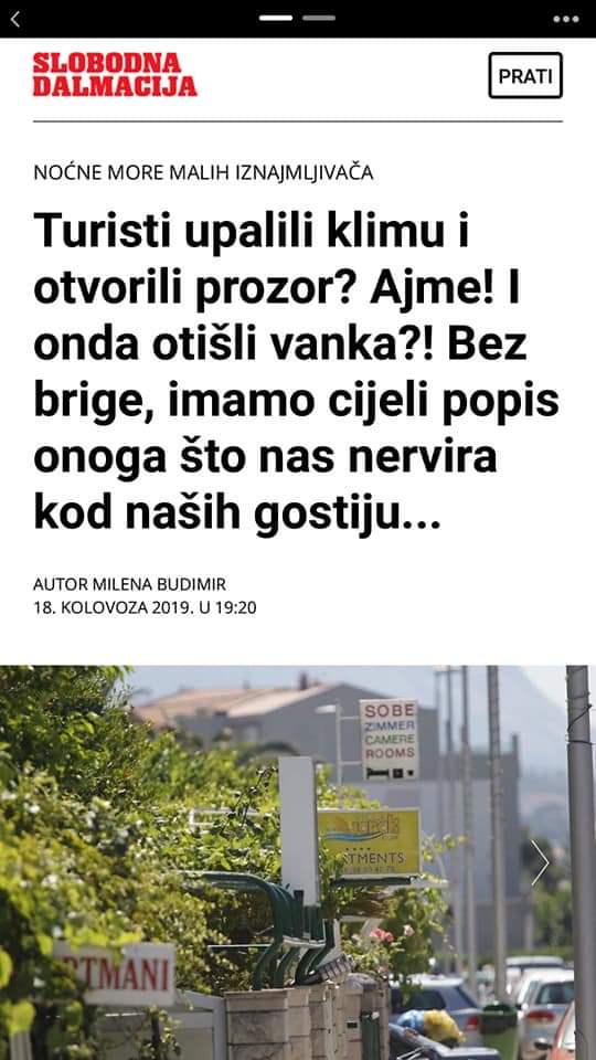 Ali ova budalaština je stvarno prelila čašu; kažu ti lumeni od novinara da su Dalmatinci netrpeljivi prema turistima kad ovi ostave klimu otvorenu u apartmanima dok su na kupanju.