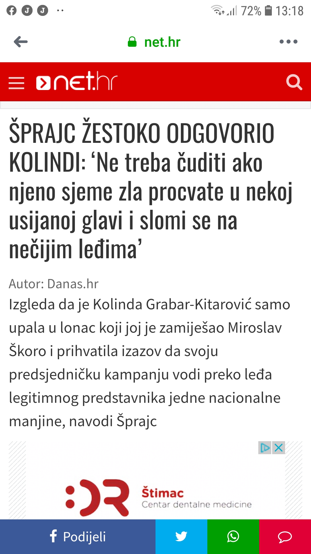 Izgleda da je Kolinda Grabar-Kitarović samo upala u lonac koji joj je zamiješao Miroslav Škoro i prihvatila izazov da svoju predsjedničku kampanju vodi preko leđa legitimnog predstavnika jedne nacionalne manjine, navodi Šprajc- a piše neokomunistički Net.hr-