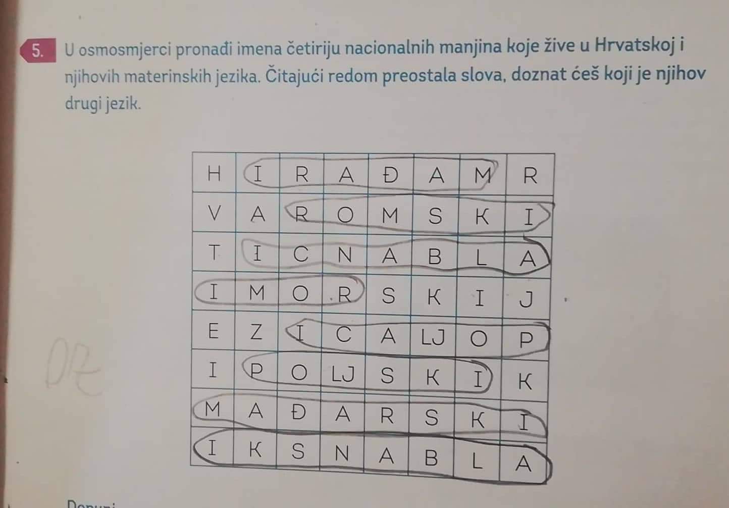 Hrvatski za 5 razred osnovne škole, križaljka, pronađi imena manjina.