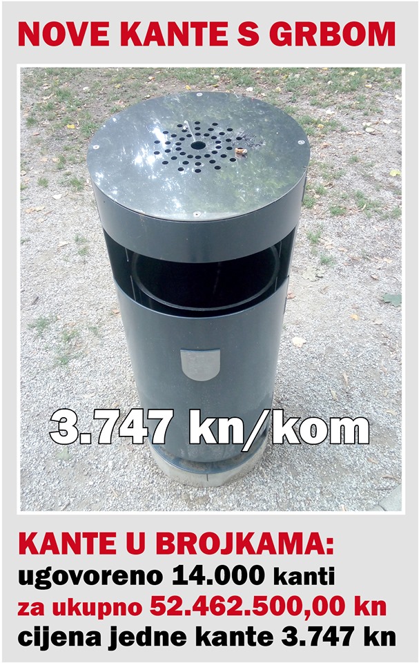 Gradonačelnikov fetiš na kante svih boja i oblika ovaj se put posrećio tvrtki Kova d.o.o. Ona će kao jedini ponuđač za sitnicu od 52.462.500 kn isporučiti čak 14.000 cilindara zapremine 35 i 50 litara nasađenih na betonsko postolje i okrunjenih pepeljarom.