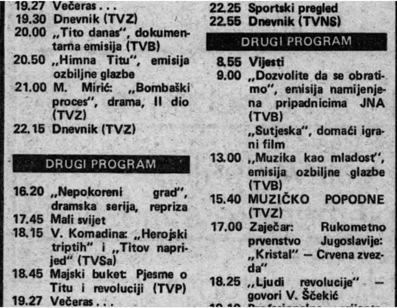 Program hrvatske televizije nekada (osamdesetih) i sada (screenshot otprije par mjeseci). Naoko nema više klasične indoktrinacije “tekovinama” socijalizma kao nekada. Međutim, i dalje se truje titoizmom, eno ga u udarnom terminu prvog programa još uvijek.