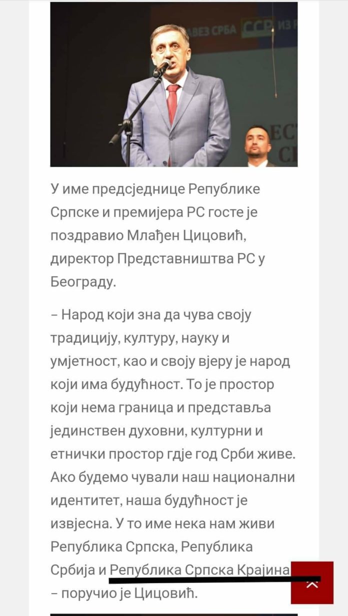 Na njemu izaslanik premjera i predsjednika Republike Srpske,  direktor Predstavništva Republike Srpske u Beogradu Mlađen Cicović je  pozdravio “krajišnike” ; “Živjela Republika  Srpska Krajina”, a naše Ministarstvo vanjskih poslova sve to mirno gleda. Veleposlanik u Beogradu kao da ne postoji, a niti oni u Subotici  u konzulatu ne reagiraju.