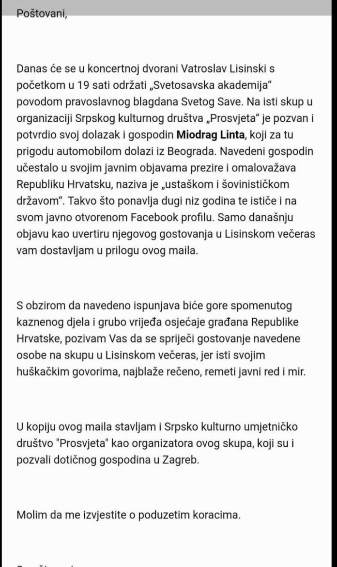 Ratni huškač Milokrad Linta opet večeras “nastupa” u Zagrebu. To je prijavljeno policiji, koja naravno nije poduzela ništa. Mail policiji vidi se na naslovnici.