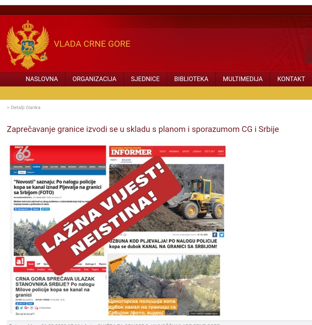 Neistinita je tvrdnja objavljena jutros sinhrionizovano u više medija u Republici Srbiji prema kojoj je proteklih dana počelo „po nalogu policije“ kopanje kanala na granici sa Srbijom i to kako bi se navodno „spriječio dolazak vjernika iz Srbije na litije“.