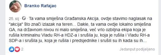 Branko Rafajac, jutros uhićen zbog ubojstva maloljetnice, bivši je istaknuti član Građanske akcije koja je prosvjedovala protiv Thompsonova koncerta u Puli i koja je davala potporu uvođenju ćirilice u Vukovaru. Navodno je tip administrirao i Facebook stranicu Građanske akcije. Lepa družina. P. S. Imamo hrpu zajedničkih prijatelja – pa ljudi dajte se malo na posao čišćenja FB-a.-piše D. Dijanović na svome profilu.