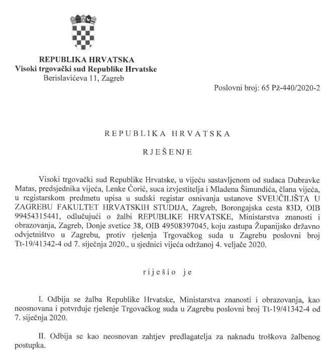 Visoki trgovački sud Republike Hrvatske donio je 4. veljače 2020. Rješenje kojim je kao neosnovanu odbio žalbu Ministarstva znanosti i obrazovanja protiv upisa Fakulteta hrvatskih studija Sveučilišta u Zagrebu. Sud je ujedno potvrdio Rješenje Trgovačkoga suda u Zagrebu kojim je Fakultet upisan u sudski registar. Rješenje o upisu javne ustanove Fakulteta hrvatskih studija postalo je tako pravomoćno, a pravna osobnost Fakulteta neprijeporna. Time je propao i zadnji u nizu pokušaja ministrice Blaženke Divjak i čelnikâ Nezavisnoga sindikata znanosti i visokoga obrazovanja – Vilima Ribića, Igora Radeke, Vesnice Garašić i Ane Petošić – da onemoguće reformu Hrvatskih studija i spriječe njezino dovršenje uspostavom Fakulteta hrvatskih studija.