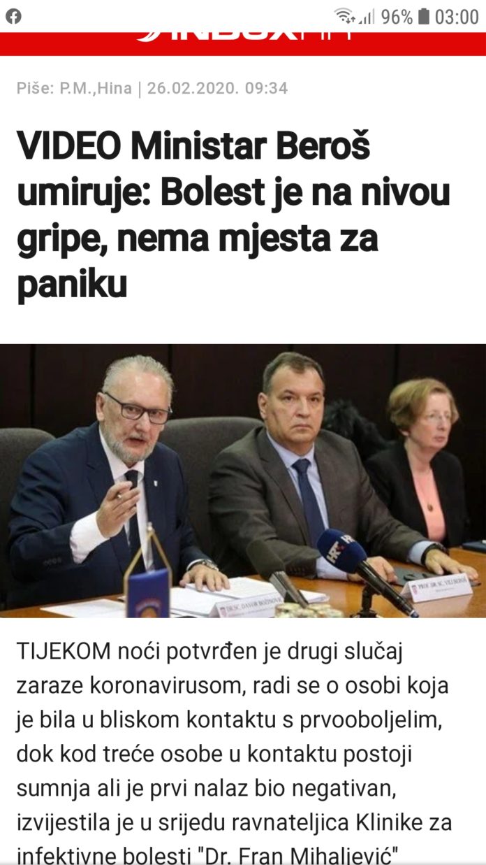“Ovo nije bolest koja predstavlja značajnu ugrozu, ona je na nivou obične gripe, više od 80 posto bolesnika je s blagim simptomima, izjavio je ministar zdravstva Vili Beroš prije samo mjesec dana”.