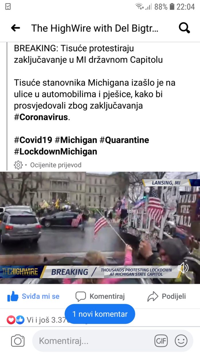 Amerika se budi nakon govora svoga predsjednika D. Trumpa koji je jasno rekao da će 1.5. otvoriti Ameriku, da je dosta ove izolacije, da mu je dosta WHO-a kojoj bolesno vjeruje i slijedi ju plenkovićeva vrhuška u stožeru civilne zaštite, a mediji otvoreno lažu o ogromnoj podršci daljnjoj izolaciji i Plenkoviću.