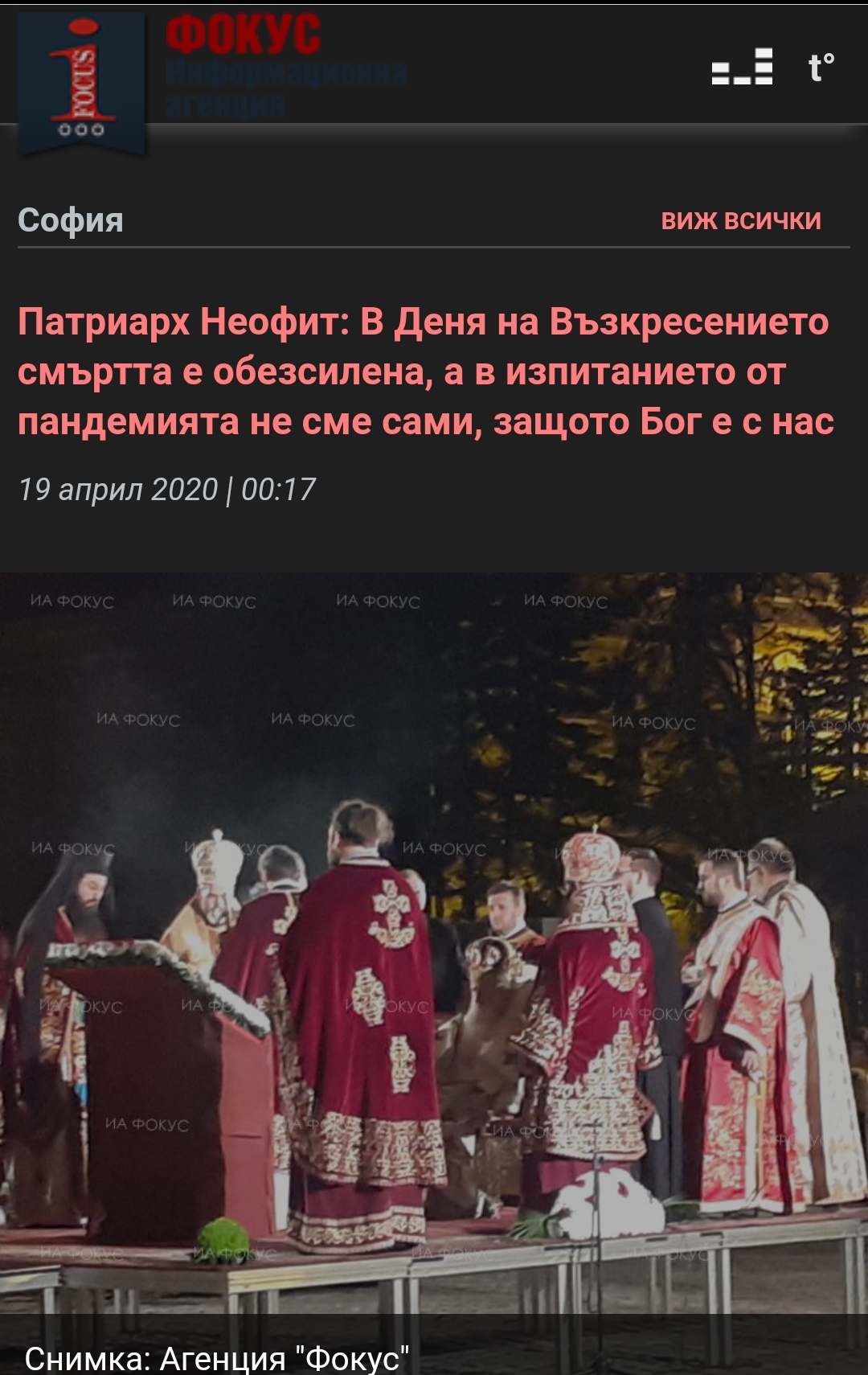 To je rekao njegova svetost patrijarh Neofit tijekom svečane bogoslužbe za Uskrsnuće Kristovo ispred patrijarhalne katedrale “Sveti Aleksandar Nevski”, napisao je reporter novinske agencije FOCUS.“U ovu najsjajnijoj noći nitko ne može tugovati ili se bojati, jer svi smo pozvani ući u radost Gospodina našega i pripremljeno je mjesto za svakoga od nas u kraljevstvu nebeskog Oca”, rekao je patrijarh.Po njegovim riječima, prolazimo kroz teško iskušenje jedne pandemije sa cijelim svijetom.