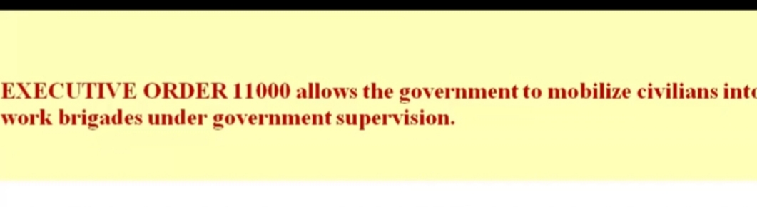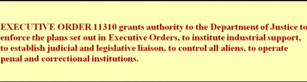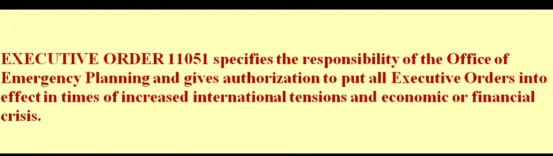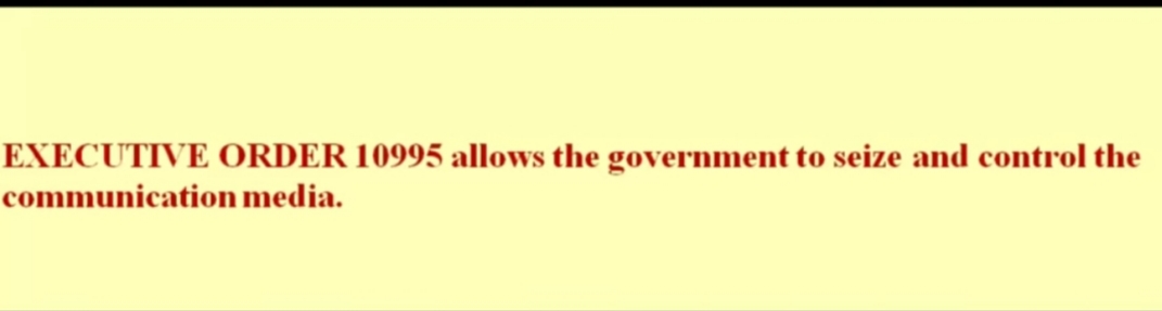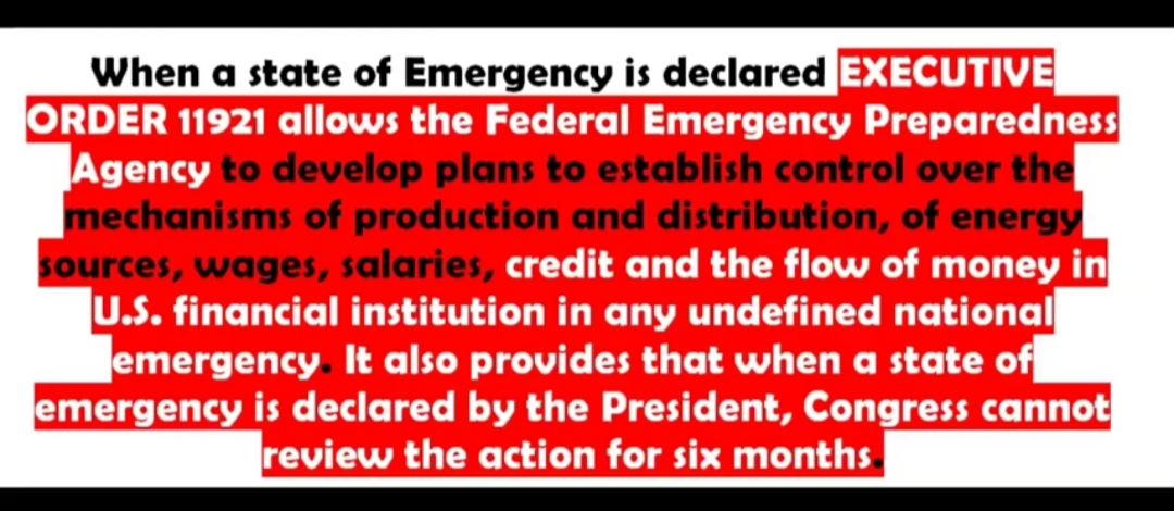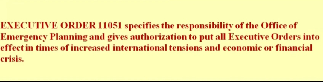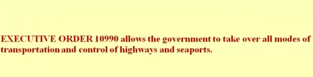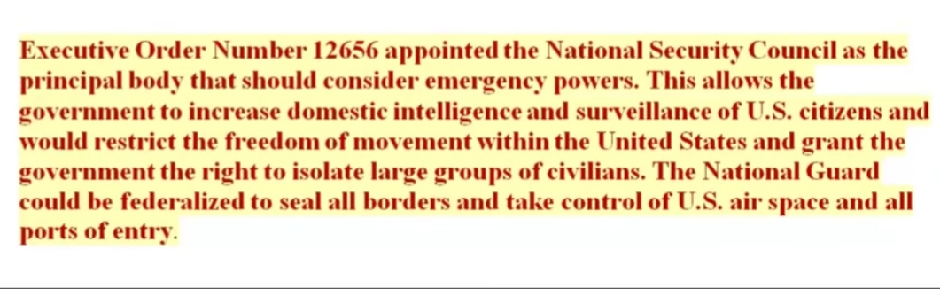 Tom deklaracijom suspendira se ustav, rad kongresa na 6. mjeseci, daju se ogromne ovlasti FEMA-i, od mogućnosti zatvaranja osoba bez sudova, suspenzija zakona, hapšenje bez sudskog naloga, preseljenja ljudi, uspostavlja se vlast nad civilnim zrakoplovstvom…drugim riječima oni upravljaju državom.