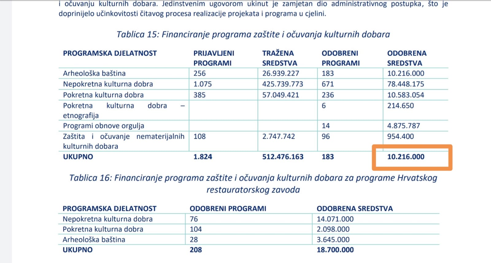 Umjesto brojke 105. 292 066 kn u zbroju stavki za očuvanje kulturne baštine , piše da je ukupna brojka utrošenog 10.216 000 kuna. Zamislite da privatnik fula zbroj za 95. milijuna kuna.