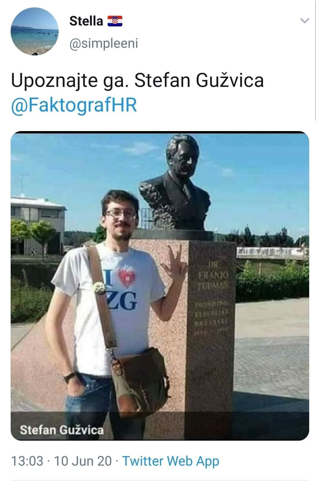 Čovjek ovako pozira u Vukovaru. Inače, na njegovom FB profilu možete vidjeti neprestano veličanje Lenjina, komunizma, Tita i ostalog šljama.