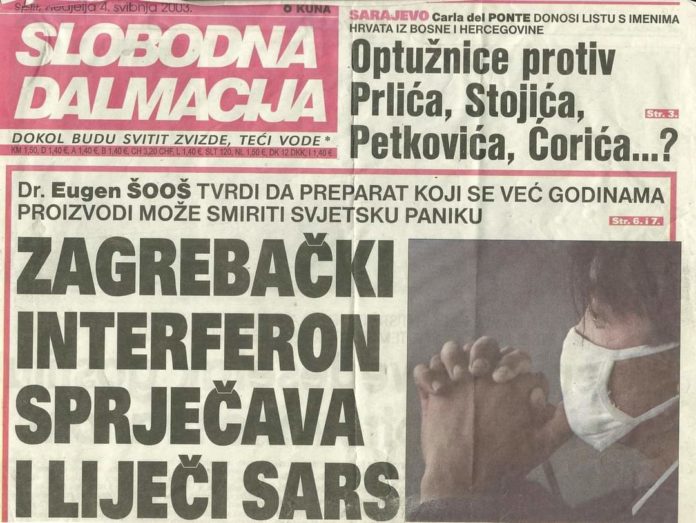 Naslovnica Slobodne Dalmacije iz 2003. o „zagrebačkom interferonu koji spriječava SARS”