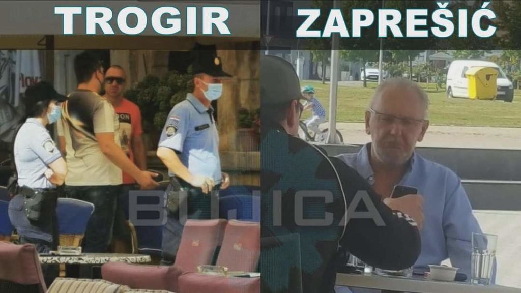 Na terasi kafića u Trogiru dvoje policijskih službenika, u društvu sanitarnog inspektora, prilaze građaninu i upozoravaju ga da stavi masku. S druge strane, na terasi jednog kafića u Zaprešiću, ključni čovjek Plenkovićevog Stožera i ministar policije Davor Božinović, ispija kavu – bez maske i tzv. socijalne distance…