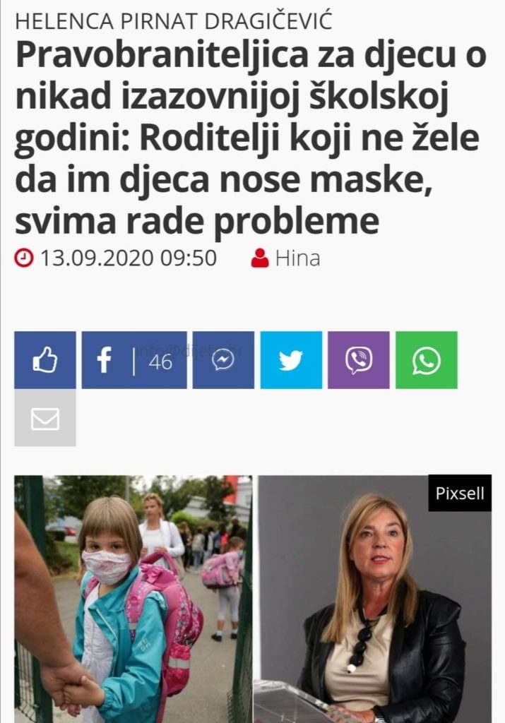 Odluka stožeraša Capaka da prvo maske ne trebaju nositi zdravi ljudi jer to nema smisla, je tako evoulirala  u 6 mjeseci pa se djeca danas guše pod maskama u školama, 7-8 sati u školi, a pravobraniteljica za djecu diskriminira otvoreno djecu koja ne žele nositi masku.