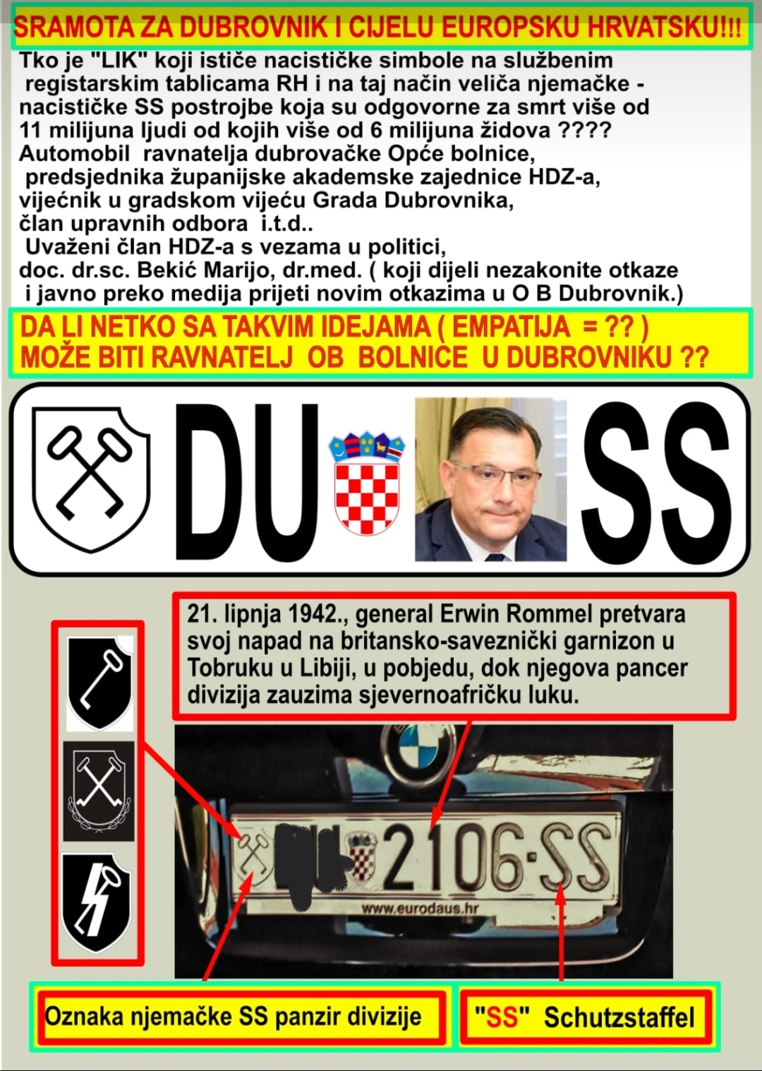I na kraju pojavi se i neka priča oko regstracije vozila ovog stručnjaka i brodogradilišnog poduzetnika Bekića, ravnatelja bolnice. Navodno registracija vozila ima veze sa hitlerovim generalom Romelom, nacistima..Ma to su samo slučajnosti, teorije zavjere..