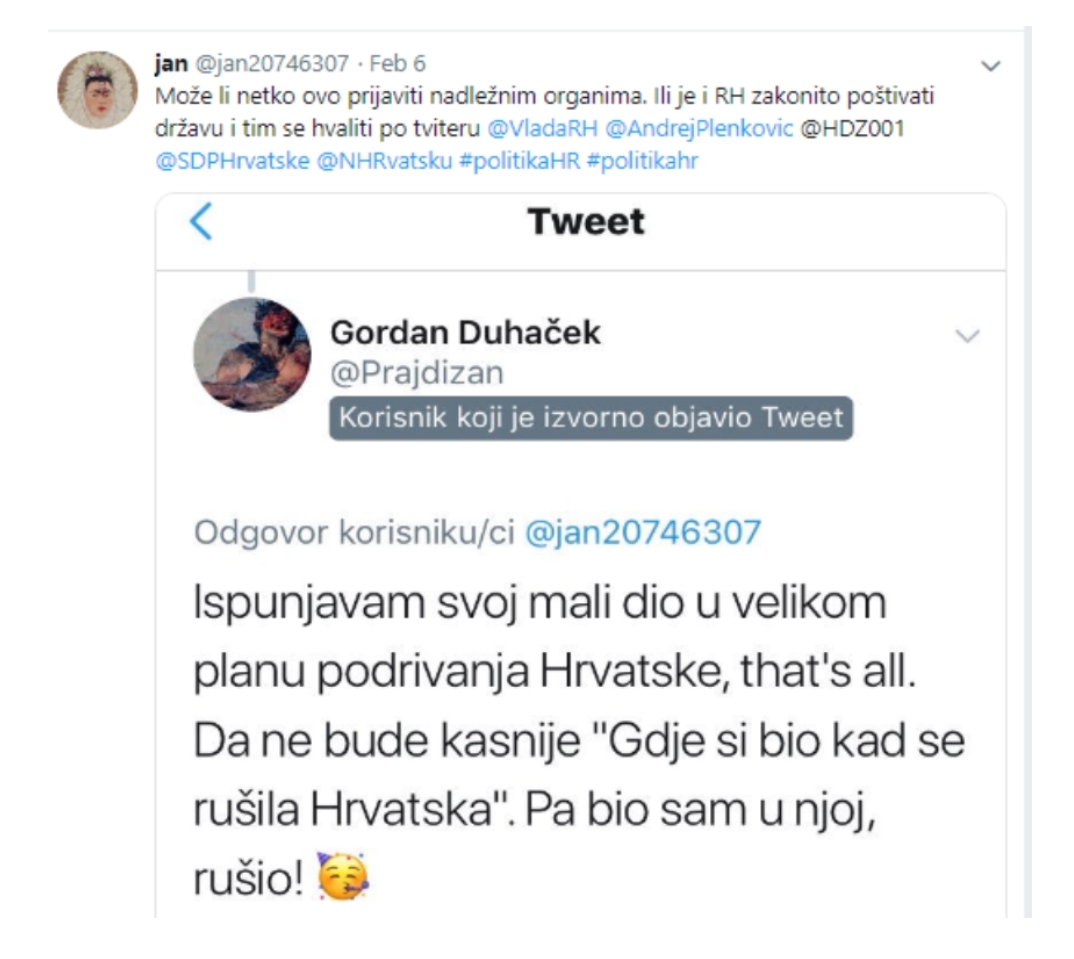 Ukoliko se pojedincima mjeri svaka riječ izgovorena privatno i ukoliko država uzima sebi za pravo da redigira i usmjerava litentiu poeticu pri iznošenju stavova i prakticiranju demokratskih dužnosti i prava građana, a koji nadilaze dužnosti službenika, onda ta država dovodi u pitanje svoj demokratski karakter i uvodi verbalni delikt pri kojemu građani više ne smiju izražavati nikakvu kritiku vlasti ili stav prema društveno-političkim pitanjima. Naposljetku, tko je cenzor za „vaganje“ riječi i njihovog smisla ako se one vade iz konteksta i može im se pripisati značenje i interpretacija ovisno o onome tko tuži i tko sudi? Jesu li to mediji i portal koji je iskonstruirao čitavu priču? Ili se samo nekima određenog svjetonazora sudi i lišava ih se posla u javnim službama? U demokratskoj državi vlast nije vrhovni arbitar savjesti niti to može biti kao u totalitarnim društvima.