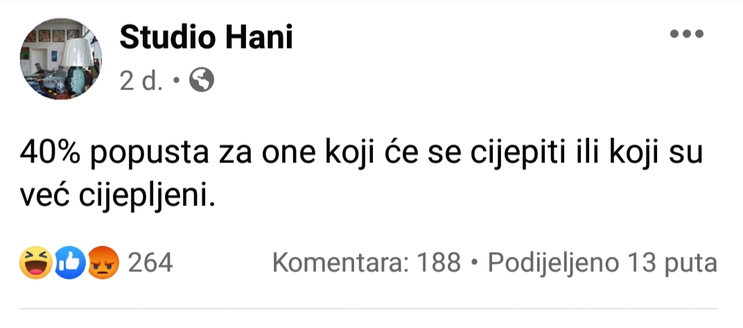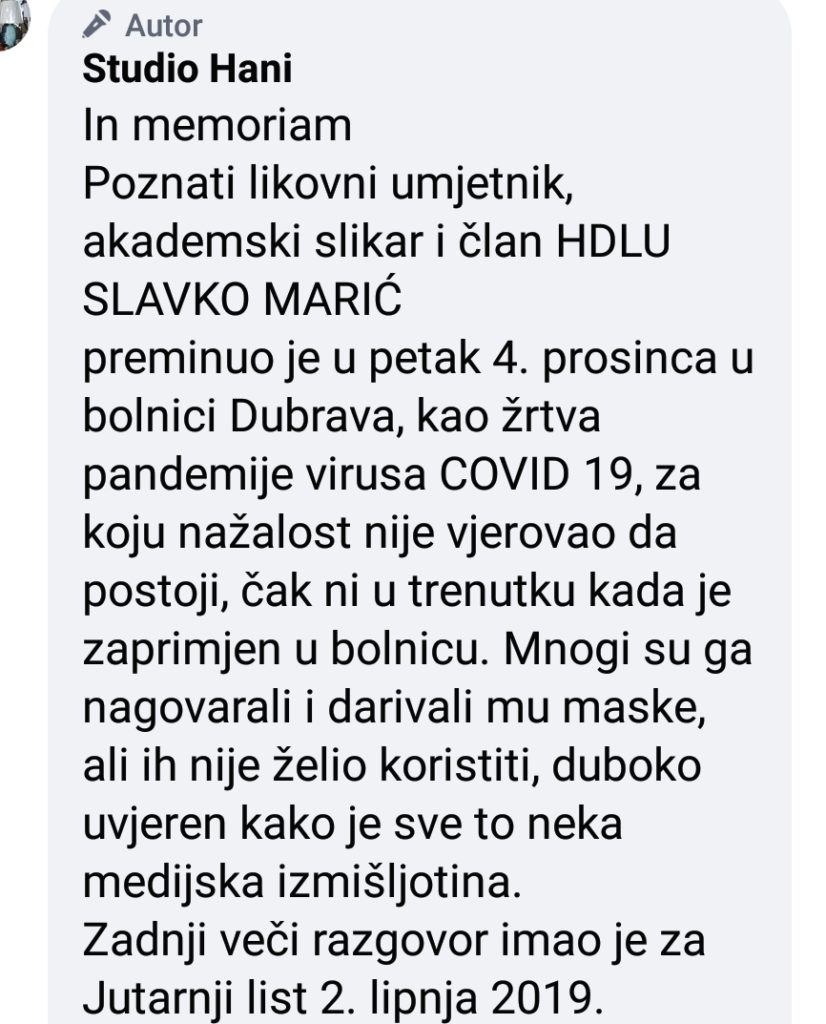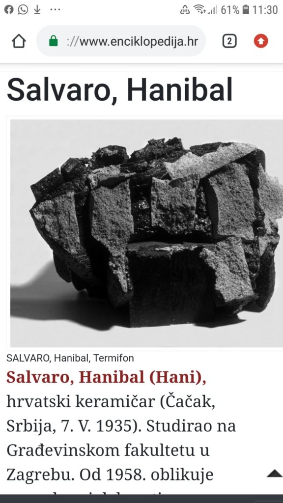 –Hrvatska kulturna politika je dovela do upravo razornog stanja u kulturi – sad je i neki keramičar iz Čačka koji se vodi pod imenom Hanibal Salvaro pod medijskim napumpavanjem novinarskih neznalica i njihovih portala nazvan umjetnikom. No to nije sve, taj keramičar iz Čačka vodi neki “Studio Hani” na Medveščaku 49 u Zagrebu u kojemu je prije 2 dana, preko svoje facebook stranice ponudio popust na svoja tzv. umjetnička djela “za sve one koji će se cijepiti ili koji su već cijepljeni”.