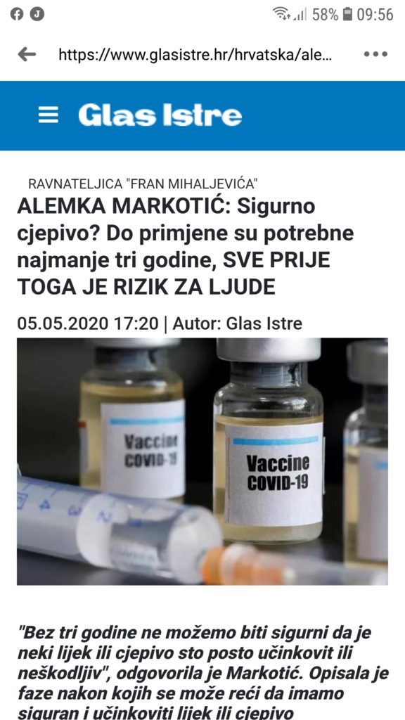 Za sada sam naučio da se zrakoplovi za obranu zemlje kupuju javnim natječajem, pogodbe bez natječaja su sumnjive, na to graknu odmah svi mediji, ali kada se nabavlja cjepivo koje će utjecati na naše zdravlje, to tada nije bitno. Nabavlja se cjepivo i prije odobrenja zdrastvenih agencija na europskom i državnom nivou bez da itko zna kuda nas sve to vodi. Tko ne vjeruje u to cjepivo, njega prozivaju nestručnjaci u takvim medijima.