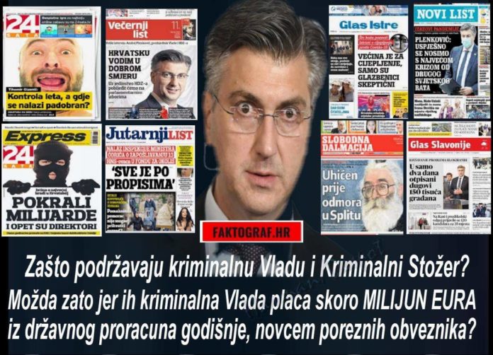 “Radi se o isplatama za tiskovine Večernji list, 24 sata, Jutarnji list, Slobodna Dalmacija, Novi List, Glas Istre i Glas Slavonije. Ukupno je ovih 7 dnevnih novina dobilo 6.916.200,76 kn ( oko 923.000 eura ) iz 37 izvora koji su vezani za državni proračun.”?!