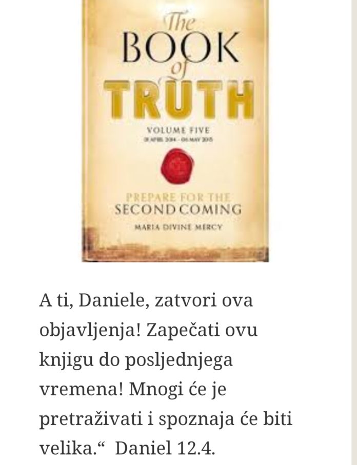 “… Knjiga Istine je najveći Dar koji Sam Ja dao svijetu, otkada Sam poslao Moga jedinog Sina da vas otkupi. Ja ostavljam u baštinu ovaj Dragocjeni Dar da bi otvorio vaše srce, oslobodio vašu dušu od njene navezanosti na đavolske napasti i pomogao vam pripremiti se za Moje Kraljevstvo…