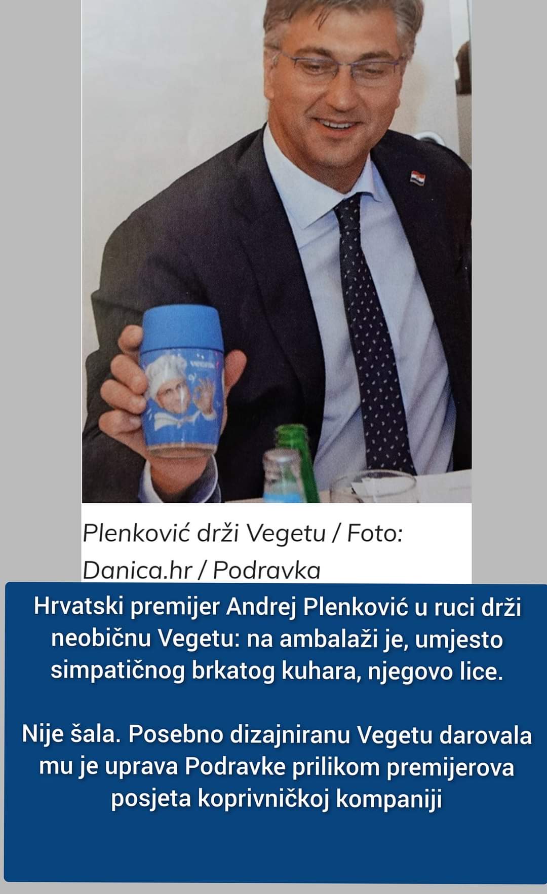 -Nešto si razmišljam: u sklopu iduće reforme, a pod stručnom palicom Martine Dalić Borg, bilo bi dobro da se i Vegeta, a ne samo HOS, zabrani, tj. jednostavno prestane proizvoditi. Kakva je to država u kojoj je najpoznatiji začin u državi djelo bivše dužnosnice Ustaškog pokreta koja je od strane partizana nakon “oslobođenja” Sarajeva bila osuđena na dvadeset godina zatvora? Svi oni koji konzumiraju vegetu zapravo su prikriveni ustaše. Molim Faktograf da provjeri ovu tvrdnju i pripremi stručni elaborat za stručnjakinju Dalić.-piše D. Dijanović.