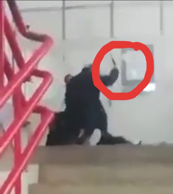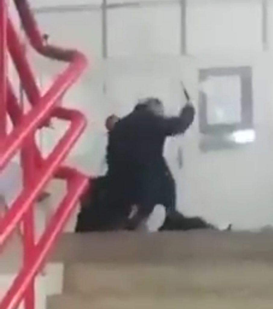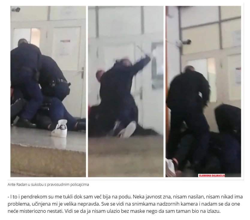 Lokacija Općinski sud Split, pravosudni policajci mlate civila koji nije imao masku. Jasno se vidi prekoračenje ovlasti, jer više policajaca je na njemu, udaraju civila , a što su mogli savladati jednostavnim nedozvoljavanjem prolaza građaninu sa suda i pozivanjem policije.