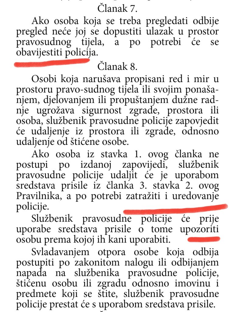 Pravosudni policajci jednostavno su trebali zapriječiti prolaz i pozvati policiju , a pitanje je veliko i da li su upozorili građanina da će nad njim biti primijenjena sredstva prisile, znači ako i to nisu učinili i po tom članku pravila postupanja napravili su težu povredu radne dužnosti. Što je neviđeni skandal pravosudnih tijela.