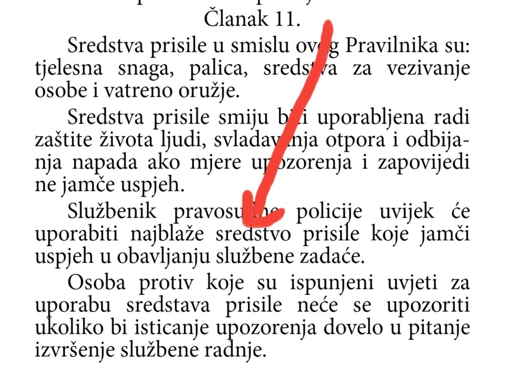 Ovdje se svakako ne radi o najblažem sredstvu prisile jer se vidi i iživljavanje udaranjem po tijelu, a više je policajaca u postupanju. Znači policajci su napravili težu povredu sl. dužnosti.