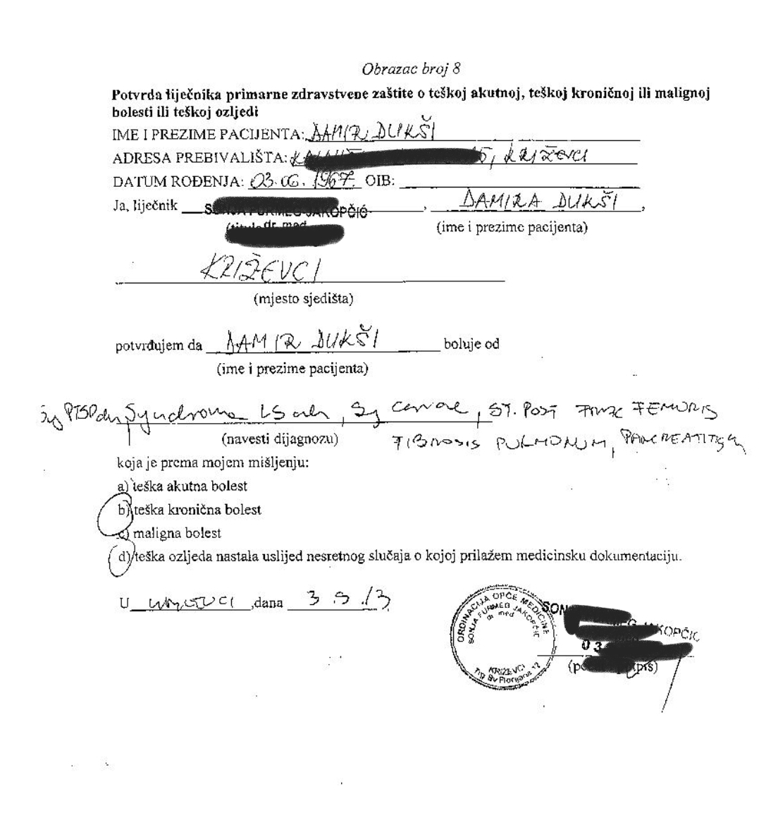 Bolujem od niza teških i kroničnih bolesti poput PTSP-a fibroze pluča ,astma kaligenoze ,,žučnih kamenaca ostopenia,myalgia,polyarthargia,pancetritis chr.,gastroenteroloških bolesti ,te bolesti lokomotivnog sustava.