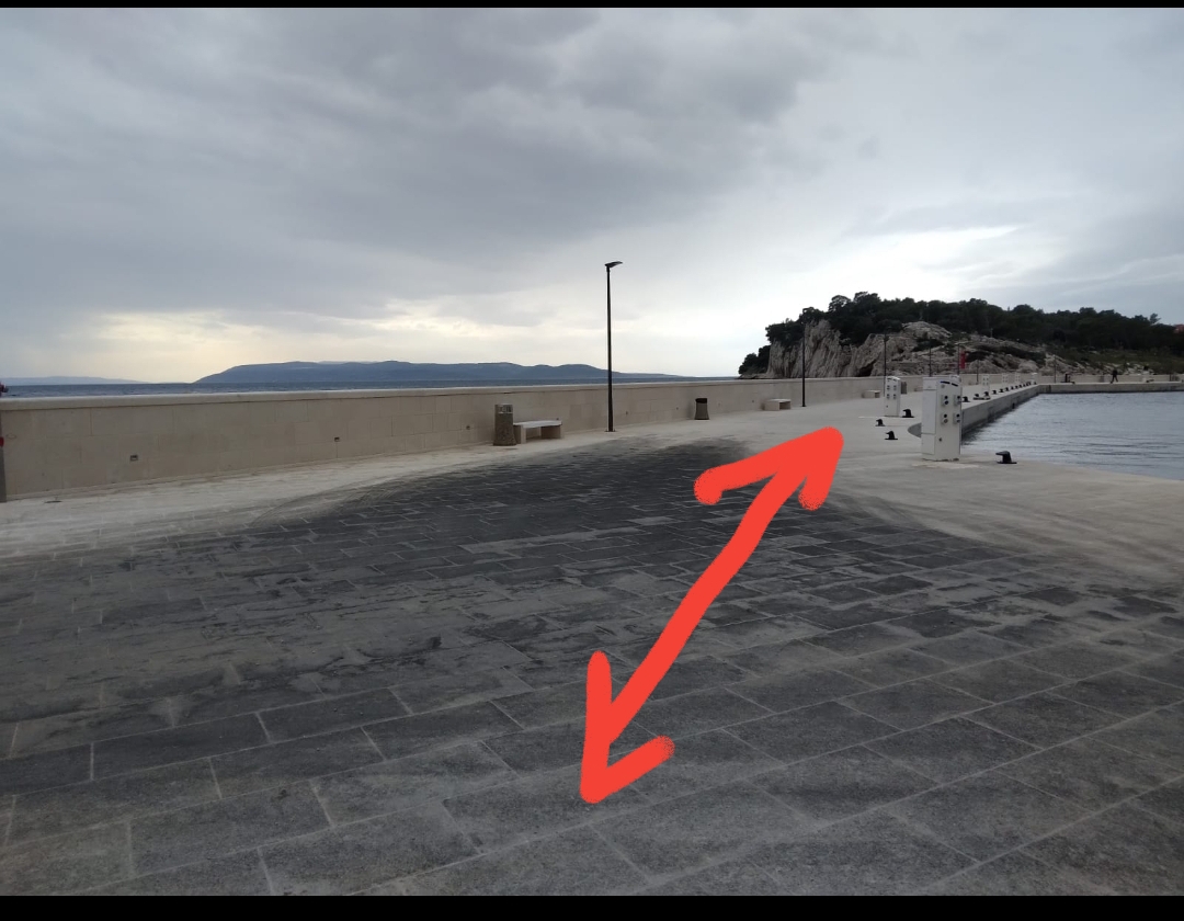 Vrlo jasno se vidi da umjereno valovito vrijeme probija umjetne plaže, plavi ih, te za sobom povlači građevinski materijal, odnosno šljunak duboko u more.