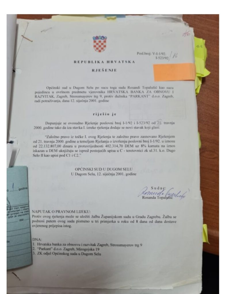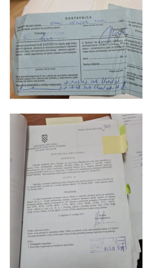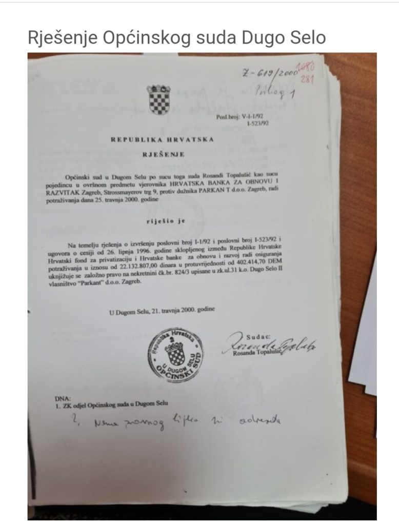 Gospodi sa suda, radi edukacije, objavljujemo ekskluzivna rješenja, rijetko viđena u sudskoj praksi. Rješenje od 25 travnja 2000 godine napisano 21. travnja 2000 godine bez upute o pravnom lijeku i bez dostavne naredbe. Dopuna rješenja od 25. travnja 2000 godine, nadopuna rješenja od 25. travnja pravnim lijekom i dostava nepostojećoj pravnoj osobi Parkant, koja i nije vlasnik nekretnine, i na kraju Ispravak toga istog rješenja u kojem stručnjaci sa suda ispravkom odmah promijene i stranku u postupku… kako im odgovara. Problem je samo što niti jedna od tih stranaka ne postoji već punih 17 godina, a ne postoji ni nekretnina iz tzv. ovršnih isprava u kojima ovršenik nije stranka. Rješenje Županijskog suda koji ukazuje na propuste, i koji je ukinuto rješenje o upisu založnog prava, Općinski sud u Sesvetama i Stalna služba Dugo SElo, NE DOŽIVLJAVAJU, za njim pravomoćne i ovršne sudske odluke nisu obvezujuće, a isti taj sud ih je donio. Njima to nije važno, oni datume, stranke, nekretnine, z.k. uloške, sve mijenjaju preko noći.