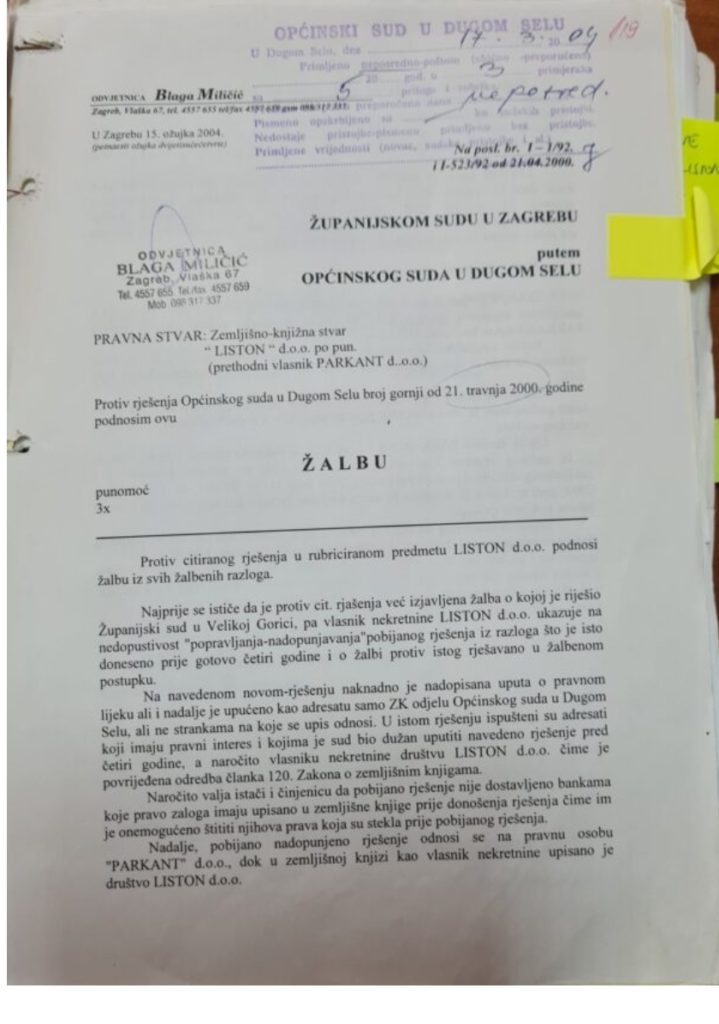 tako protivnik osiguranja “Parkant” d.o.o. ne postoji niti je vlasnik nekretnine od 2000 gdoine? Kako to sutkinja opravdava? Kako opravdava činjenicu da u predmetu Pu Ovr 54/2019 je podnešena žalba protiv rješenja I-1/92 od 21. travnja 2000. godine koje je dostavljano nepostojećoj pravnoj osobi Parkant d.o.o. dana 08.04.2004. godine sa nadopisanim pravnim lijekom, a da žalba protiv toga rješenja nije riješena još od davne 2004. godine do 2021. godine (nalazi se na strani 103. spisa)?