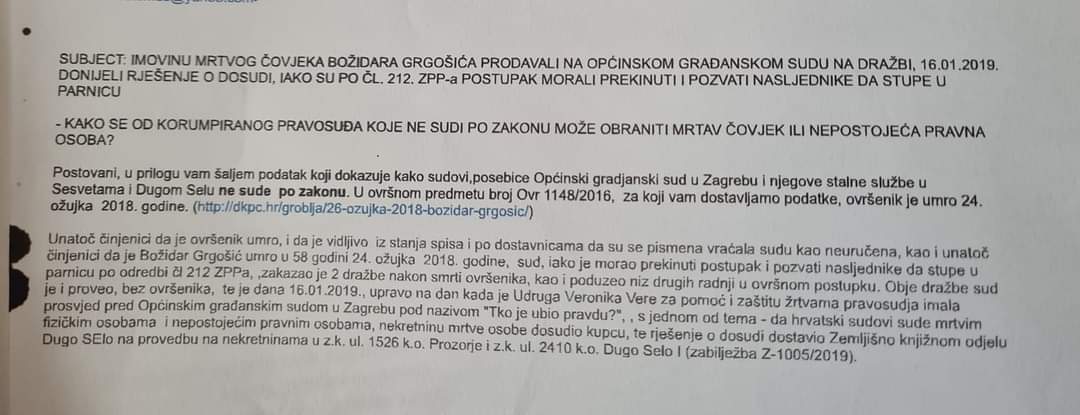 Suci Općinskog suda u Sesvetama ljute se kad im se ukaže na brojne nezakonitosti…..a iz priloženog se sasvim jasno vidi da je njima svejedno; BIO ŽIV ILI MRTAV, POSTOJAO ILI NEPOSTOJAO oni sude, rasprodaju imovinu mrtvih ljudi i nepostojećih pravnih osoba. O svemu sam više puta obavijestila i sud, i ministra pravosuđa i premijera, uzalud, njima je sve što suci rade PERFECT.