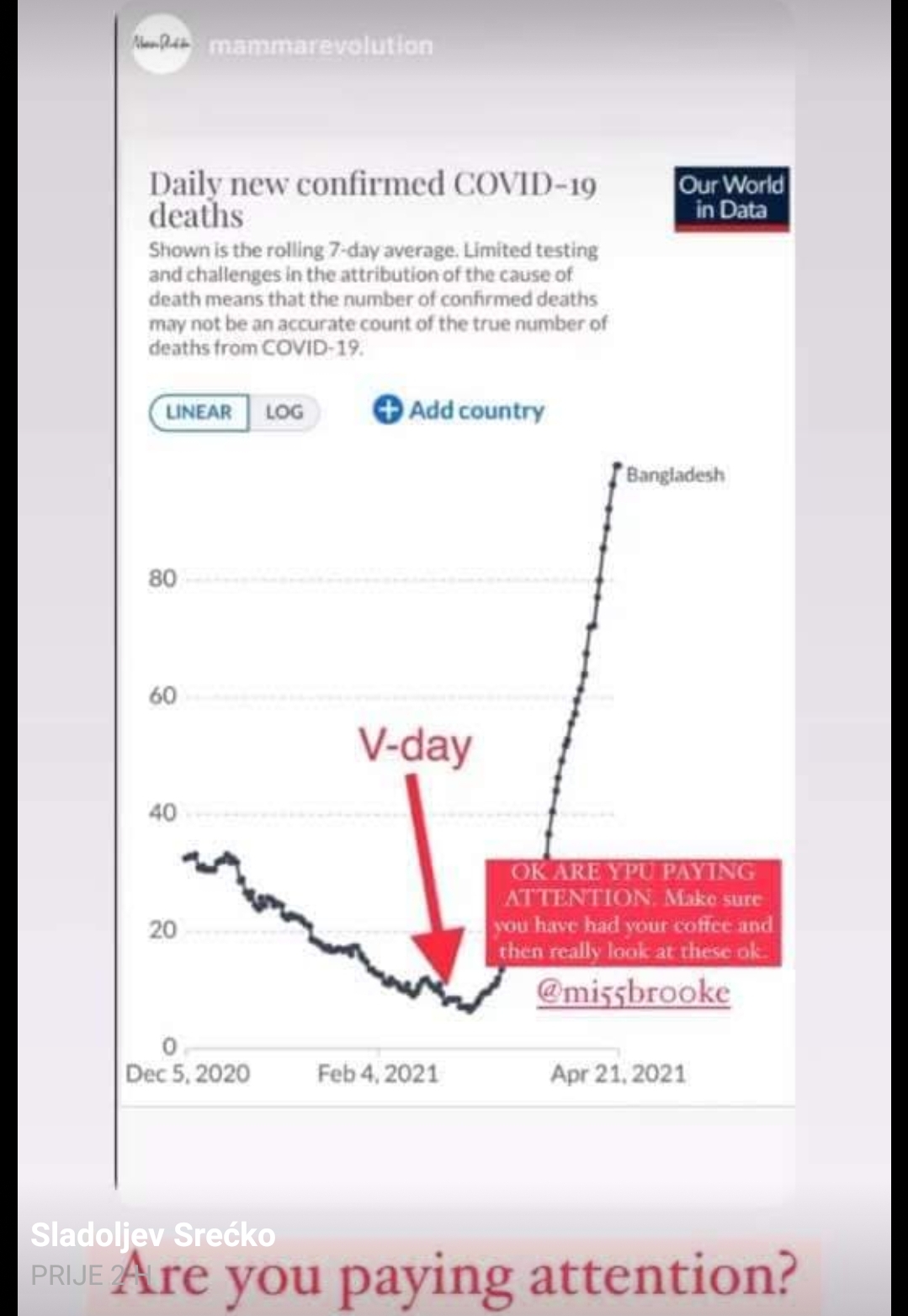 Pogledajte kako izgleda najnoviji “VAL PLANdemije” nakon pokretanja i masovnog odaziva na cijepljenje (V-day)! Zar za ovo stojite u redu na Velesajmu ili gdje već su vas namamili? Sretno nam bilo.-piše imunolog Srećko Sladoljev kojeg progoni Faktograf , novinarski portal, zbog drugačijeg viđenja situacije, a na izborima politička koalicija mu je podmetnula suradnike za izbore koji su sve učinili da ne prođe na izborima. Očito je on glavna opasnost ove trule i pokvarene vlasti.