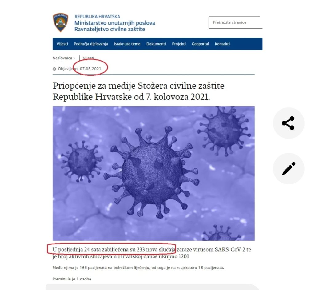 Na slici u dnu link vlada.gov.hr piše u najavi 233 a kad otvoriš link ostala izmjena (213), međutim još naniže tražilica nudi objavu od Civilne zaštite. Kod njih je 233 i u najavi i u objavi 233.