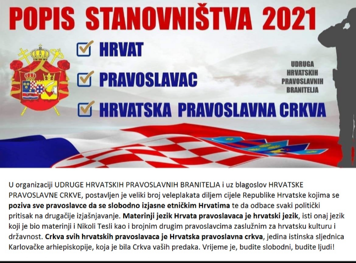 Na isti dan kad su postavljeni plakati Udruge hrvatskih pravoslavnih branitelja (uz naš blagoslov) osvanuli su plakati SDSS-a koji pozivaju Srbe da se na preko sustava e-građani na Popisu stanovništva izjašnjavaju kao Srbi, čiji je materinski jezik srpski i koji su članovi Pravoslavnoj crkvi Srbije.