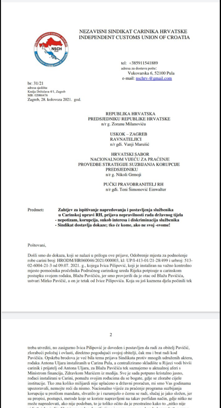 Iz sindikata Carine odjel Rijeka tvrde nešto drugo, tvrde da je moguće zapošljavanje kadrova sklonih upravo Pavičiću…Iz ovih dokumenata se vidi da su upućeni na USKOK, tvrdi se da bitne spone postoje Carine i Pavičića…ipak se čini ono najvažnije da ministar Z. Marić ne govori istinu, po svemu sudeći on je u sukobu interesa iz priloženih dokumenata i svjedočenja zaposlenika Carinske uprave Rijeka.
