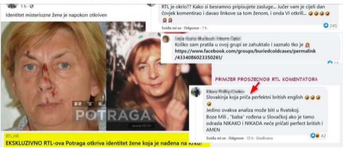 U “svom” “ekskluzivnom” otkriću RTL je sebi (naravno u ovoj našoj kokošarskoj prćiji) prigrabio sve zasluge “otkrivanja” žrtvinog identiteta prešućujući pri tome da su do toga “otkrića” došli čitajući objave u FB grupi “Buried Cold Cases: Little-known unsolved murders & missing persons cases” čiji link su, dan prije, dobili u par komentara.