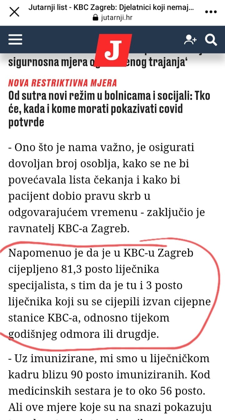 Ravnatelj KBC-a Zagreb Ante Ćorušić kaže: Napomenuo je da je u KBC-u Zagreb cijepljeno 81,3 posto liječnika specijalista, s tim da je tu i 3 posto liječnika koji su se cijepili izvan cijepne stanice KBC-a, odnosno tijekom godišnjeg odmora ili drugdje. (Jutarnji list)